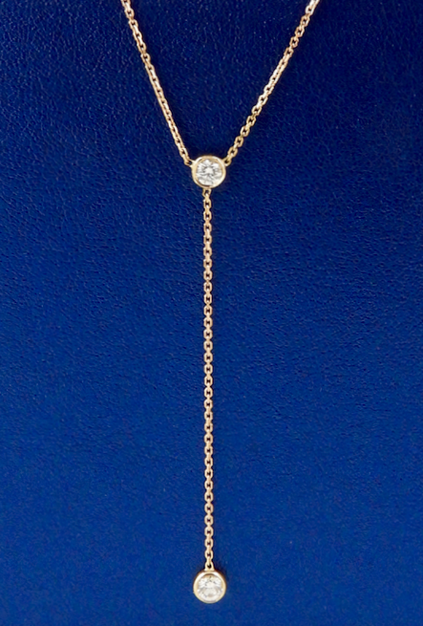 18 karaats gouden ketting (geelgoud, witgoud of roségoud) ingezet met 2 diamanten van ieder 0,10 karaat, kwaliteit VS, kleur G. Deze ketting is door ons ontworpen en gefabriceerd in Antwerpen.